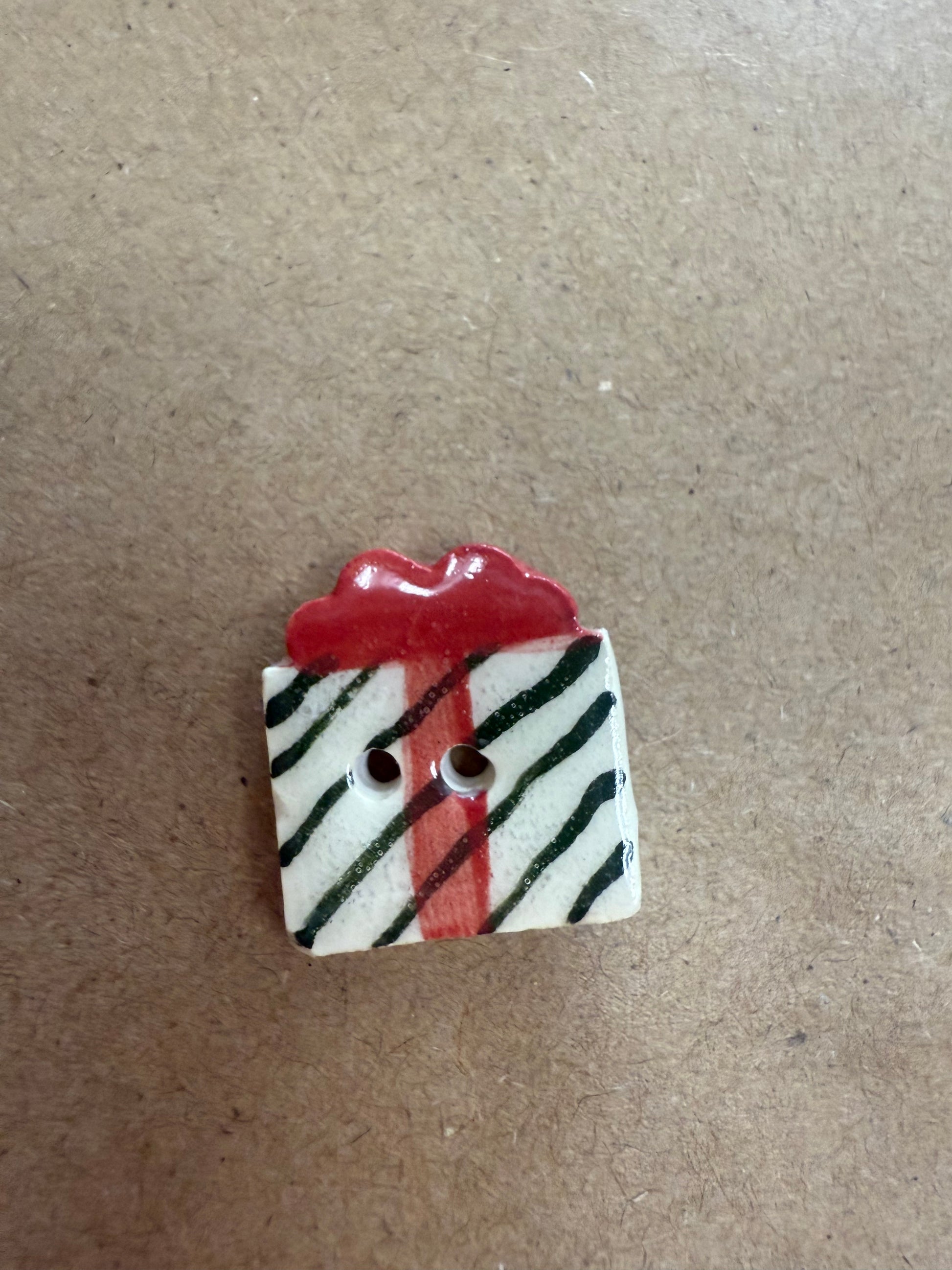 Gift box, large green striped/red bow porcelain button
